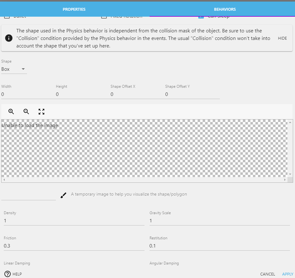 Additionally, objects with the Physics 2 behavior ignore the object's Collision Masks and instead use the collision shape configured on the BEHAVIORS tab of the object itself. This defaults to a box matching the full dimensions of the object. The shape can be changed to a circle, edge, or polygon from within the BEHAVIORS tab.